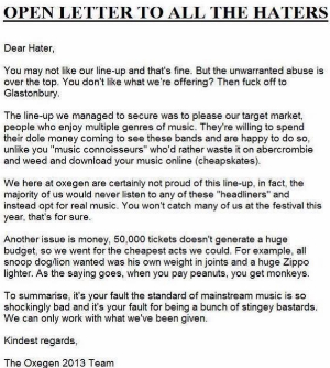 Now, amidst the backlash, a hilarious letter claiming to come from Oxegen chiefs has surfaced online - addressing the ‘haters’ who’ve made it known that they’re not happy with the line-up.
