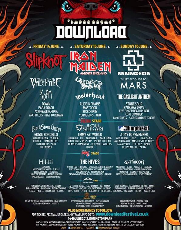 Headlined by Slipknot, Iron Maiden and Rammstein, Download Festival takes place 14th to 16th June 2013 in Donington Park.