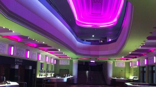 Eventim Apollo has also undergone a huge visual transformation. Highlights of phase one of the renovation include fixtures and fittings to original designs, restoration of the ornate plasterwork and historically sensitive decoration to match the original paint scheme. The refurbishment also revives the two marble staircases currently concealed beneath the extended stage, as well as restoration of the original foyer floor mosaic panels, whilst in the circle the original windows are revealed allowing natural light to once again flood the circle bar. New multi-colored LED lighting on the façade highlights the new venue’s prominence.