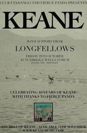 Ahead of the release of their 'Best Of' album, Keane will play a tiny Fierce Panda gig at the Tunbridge Wells Forum on Friday October 25 to mark the first ever Keane release, 10 years ago.