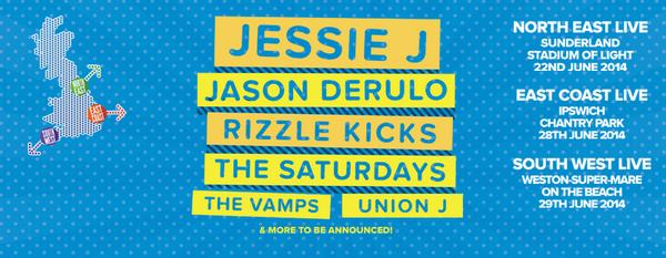 Jessie J is to headline UK Live festival, an annual pop bash which takes place over three dates in English cities including Sunderland, Ipswich and Weston-super-Mare in June 2014. Other big names confirmed for the star-studded bill include Jason Derulo, Rizzle Kicks, The Saturdays, Union J and the Vamps.