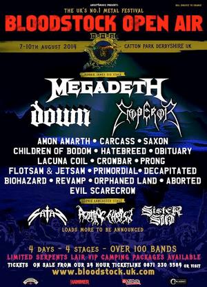 Bloodstock 2014 is shaping up to be the biggest and best yet. Friday night’s headliners are New Orleans sludgemeisters, Down. Joining them to head up Saturday night are black metal overlords, Emperor and closing out proceedings on Sunday are thrash legends, Megadeth. Also announced so far are Amon Amarth, Obituary, Crowbar, Hatebreed, Lacuna Coil, Carcass, Prong, Children Of Bodom, Saxon, Decapitated, Flotsam & Jetsam, Primordial and Evil Scarecrow. More bands to be announced shortly.