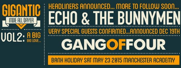 Echo & The Bunnymen and Gang Of Four have been confirmed as the first acts for the second instalment of Manchester's Gigantic Indie All-Dayer.
