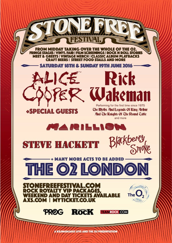 Alice Cooper, Rick Wakeman and Marillion are among the first acts confirmed to perform at the inaugural Stone Free Festival next summer.