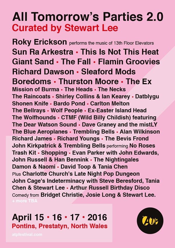 Already confirmed for the weekend are Roky Erickson, who will be performing the music of 13th Floor Elevators, and Thurston Moore, as well as Sleaford Mods, Boredom, Shirley Collins, Datblygu, John Kirkpatrick with Trembling Bells performing 'No Roses', the Necks, Ian Kearey (accompanying Shirley Collins), the Raincoats, Wild Billy Childish with the Dear Watsons, Bardo Pond, the Heads, Richard Youngs, the Ex, Shonen Knife, the BevisFrond, Trash Kit, Evan Parker with John Edwards, John Russell and Han Bennink, Shopping, the Nightingales, Sun Ra Arkestra, Richard Dawson, Carlton Melton, the Bellrays, Wolf People, Ex-Easter Island Head, the Wolfhounds, Dave Graney and the mistLY, the Blue Aeroplanes, Alan Wilkinson and Richard James.