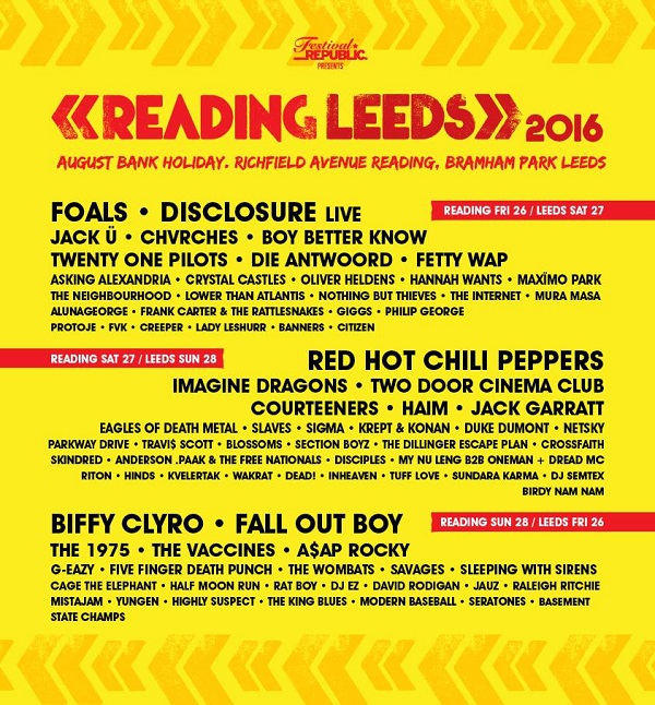 In addition to the headliners, joining the bill are Chvrches, the Vaccines, A$AP Rocky, Travi$ Scott, Haim, Jack Garratt, the Wombats, Lower Than Atlantis, Savages, the King Blues, Skindred and Die Antwoord, among others. Also set to appear across the weekend are the 1975, Slaves, The Courteeners, Twenty One Pilots, Boy Better Know, Hinds, Rat Boy, Crossfaithand DJ EZ, Imagine Dragons, Jack Ü, aka Skrillex and Diplo’s supergroup, Two Door Cinema Club, Fetty Wap, Nothing But Thieves, Crystal Castles, Parkway Drive, the Internet, Oliver Heldens, Hannah Wants, the Dillinger Escape Plan, Sleeping With Sirens, Frank Carter and the Rattlesnakes, Asking Alexandria, Creeper, Kvelertak, Citizen, Fearless Vampire Killers, Dead! and Wakrat. Check out the line up below.