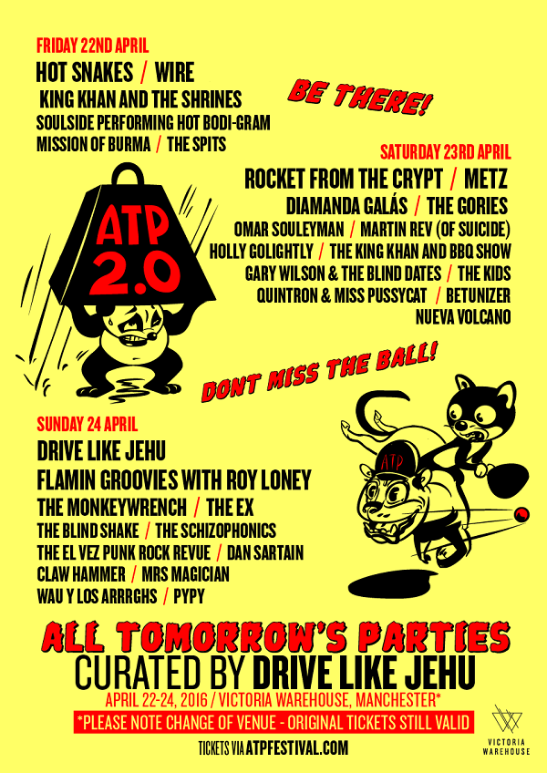 The Drive Like Jehu-Curated All Tomorrow's Parties 2.0 has moved venues from the Pontins camp in Prestatyn, North Wales to the Victoria Warehouse in Manchester.