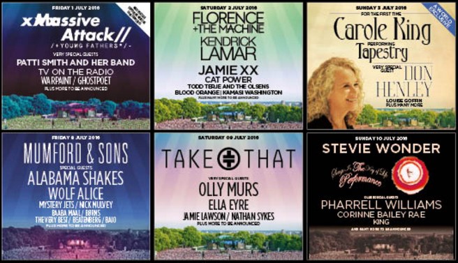 Spread across the first two weekends of July, the concert series gets underway on Friday July 1 with Patti Smith, TV On The Radio, Young Fathers, Warpaint, Ghostpoet and headliners Massive Attack, while the following day sees Florence And The Machine topping the bill with Kendrick Lamar, Jamie XX, Cat Power, Todd Terje and The Olsens, Blood Orange and Kamasi Washington providing support. Carole King closes the first weekend on July 3 with a celebration of her album, 'Tapestry', with Don Henley and Louise Goffin among those also set to appear.