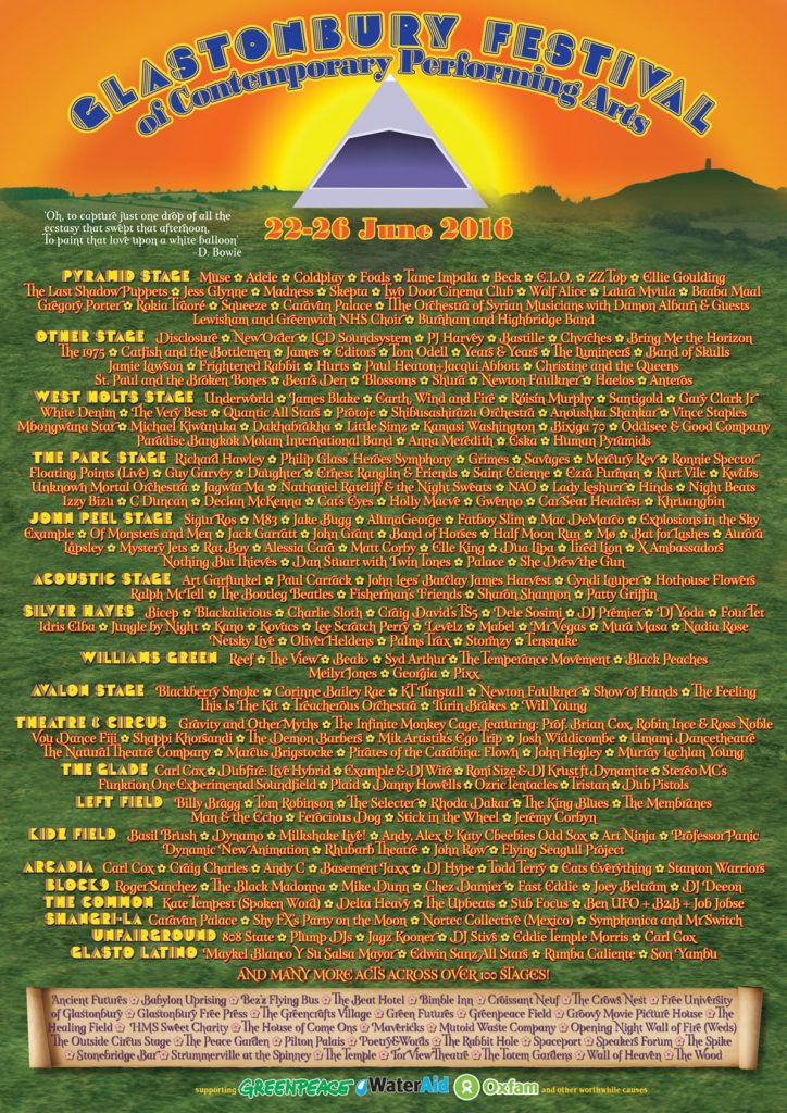 Adele, Coldplay and Muse set to headline the event, which will return to Worthy Farm between June 22 and 26. Mark Ronson, Tame Impala's Kevin Parker, Kate Tempest, Guy Garvey, Grimes, James Blake, PJ Harvey, New Order and Foals, plus loads more, are also set to appear.