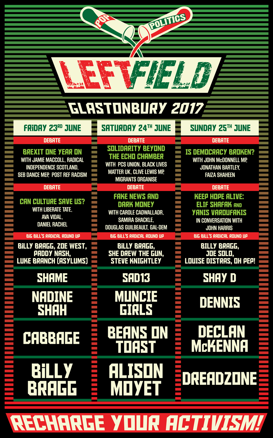 Alison Moyet, Nadine Shah and Sad13 are among the acts confirmed for Billy Bragg's Left Field stage at this year's Glastonbury festival.