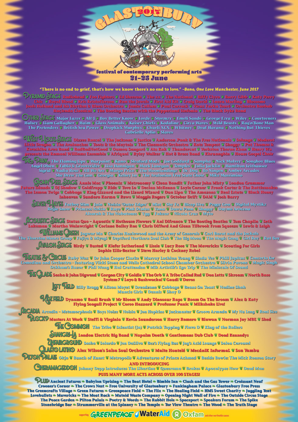 The festival returns to Worthy Farm between June 21 and 25, with Radiohead, Foo Fighters and Ed Sheeran set to headline. Head here for the full bill and below to check out the line up poster, designed by Alister Sieghart.