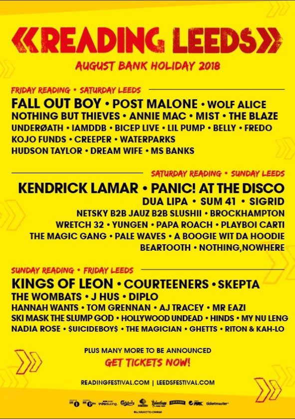 Fall Out Boy, Kendrick Lamar, Panic! At The Disco and Kings of Leon will headline Reading and Leeds this summer.