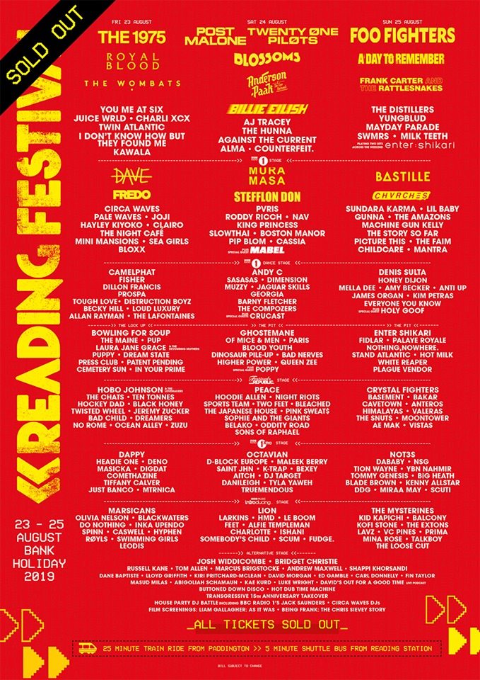 Who? Headlining the weekend are Foo Fighters, the 1975, Twenty One Pilots and Post Malone, while also set to appear are Bastille, the Distillers, Not3s, Sundara Karma, Denis Sulta, the Amazons, Yungblud, Juice Wrld, Pale Waves, Camelphat, Hayley Kiyoko, Bowling For Soup, Blossoms, Billie Eilish, Stefflon Don, PVRIS, Royal Blood, Charli XCX, Chvrches, Enter Shikari, Fredo, AJ Tracey, Gunna, Lil Baby, Anderson .Paak and the Free Nationals, You Me At Six, Frank Carter and the Rattlesnakes, A Day To Remember, the Maine, Against The Current, Circa Waves, the Hunna, the Wombats, the Japanese House, No Rome, Crucast, G Flip, Dave, Counterfeit, Mayday Parade, Milk Teeth, Machine Gun Kelly, Sea Girls, King Princess, DJ Dillon Francis, Dimension, Ghostemane, Of Mice & Men, Pip, Blood Youth, Hot Milk, FIDLAR, Mabel, Laura Jane Grace and the Devouring Mothers, NAV, Picture This, Kim Petras, YBN Nahmir, Queen Zee, the LaFontaines, Barny Fletcherand, Palaye Royale, and Plague Vendor, among others. Head below for the full line up and day splits.