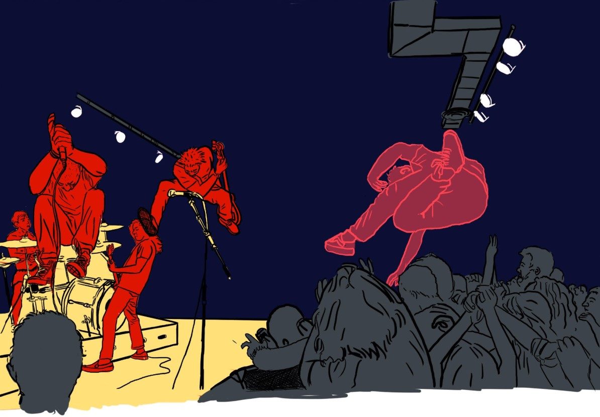 Turnstile vocalist Brendan Yates—shirtless, slick with sweat and shredded beneath a surfer’s tangle of curls—is standing on top of a speaker stack at the Globe in Cardiff. “No future!” he yells as his bandmates’ guitars churn and howl. Arms reach towards him from the morass below, and then he’s gone. One front flip later he’s part of the crowd, thrashing his way to the end of Drop just like everyone else.