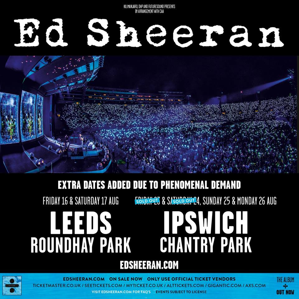 Following dates across Europe, Sheeran will play two shows at Leeds’ Roundhay Park and four consecutive nights at Ipswich’s Chantry Park in August.
