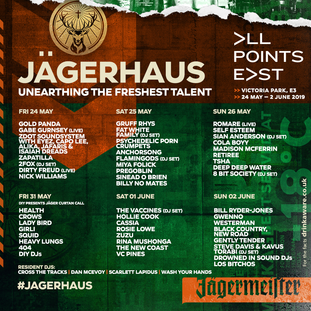 Though more acts are due to be announced, the current JägerHaus line up includes Self Esteem, Gwenno, Gabe Gurnsey (live), Rosie Lowe, Cassia, Anchorsong, Billy No Mates, Black Country New Road, Cola Boyy, Dirty Freud (live), Deep Deep Water, Gently Tender, Los Bitchos, Madison McFerrin, Miya Folick, Pregoblin, Psychedelic Porn Crumpets, Retiree, Rina Mushonga, Sinead O Brien, the New Coast, VC Pines, Westerman, Zapatilla, Zuzu, and Zdot Soundsystem with Eyez, Capo Lee, Alika, Jafaris and Isaiah Dreads. DJ sets have also been confirmed from with the Vaccines, Fat White Family, Flamingods, 2Fox, Drowned In Sound DJs, Sian Anderson, Steve Davis and Kavus Torabi, Nick Williams, TSHA and 8 Bit Society.