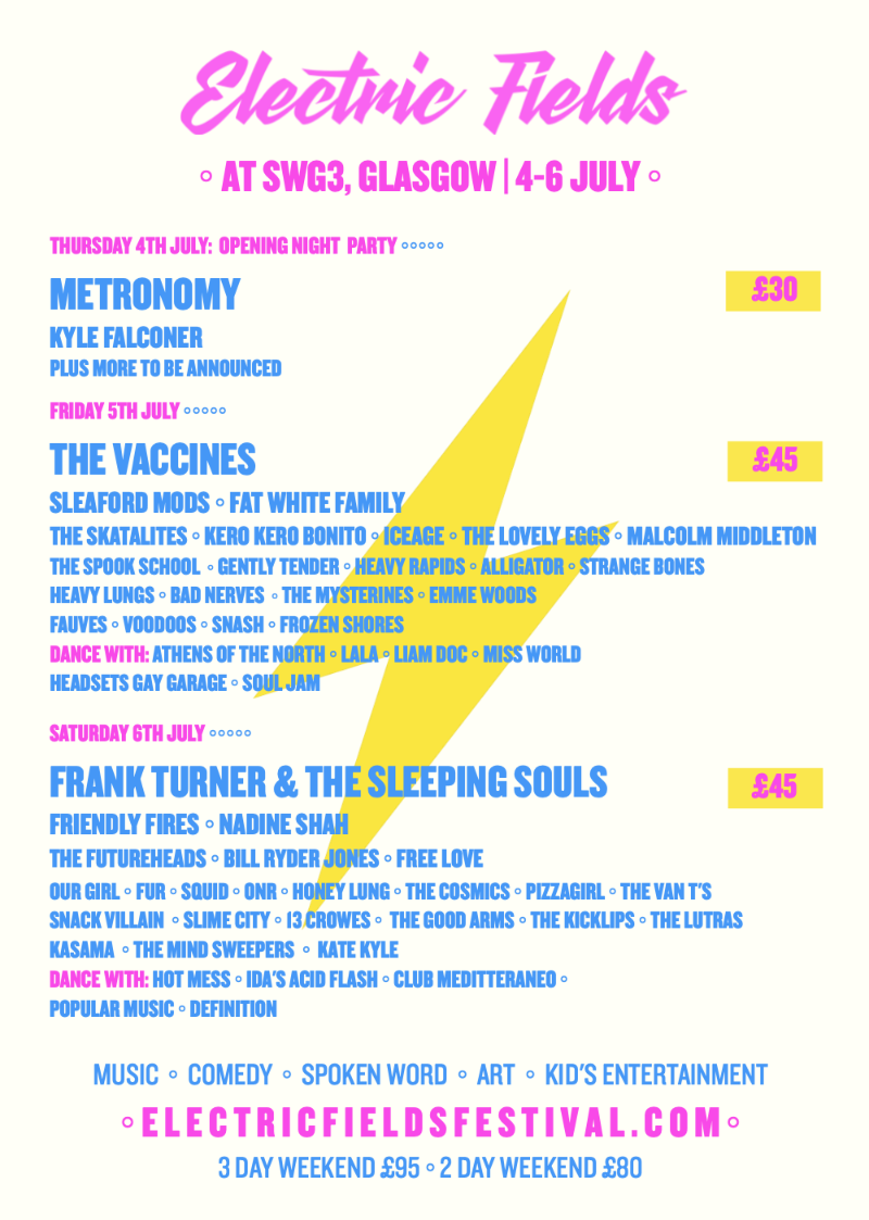 “After spending the past 5 years putting on a quality outdoor music festival we found the rising costs this year have led us to reimagining how Electric Fields takes place for 2019. Although we leave Dumfries & Galloway with a heavy heart our new venue offers a very exciting opportunity for us to flex our creative muscle and put on an outstanding show in the heart of Glasgow. We will have our full line-up joining us, excellent food and drinks and of course tons to do for little ones with Our Kids Electric. We look forward to seeing faces old and new in July.”