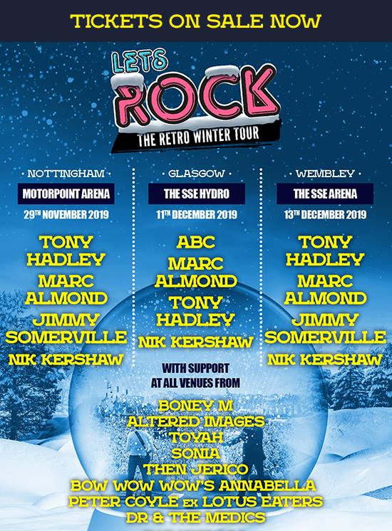 Taking over Nottingham’s Motorpoint Arena, Glasgow’s SSE Hydro and the SSE Arena Wembley between November 29 and December 13, the Let’s Rock Tour features headliners Tony Hadley, Marc Almond, Jimmy Somerville and Nik Kershaw, though ABC replace Jimmy Somerville for the Glasgow stop.