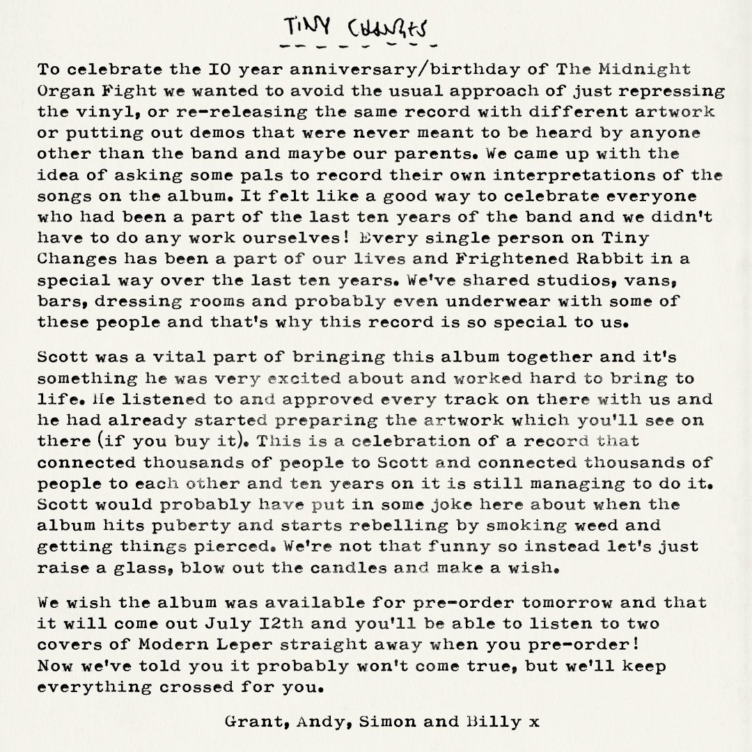 ‘Tiny Changes’ will celebrate the 10 year anniversary of the indie-folk rock band's 2008 LP ‘Midnight Organ Fight’, with renditions of the album tracks by their friends.