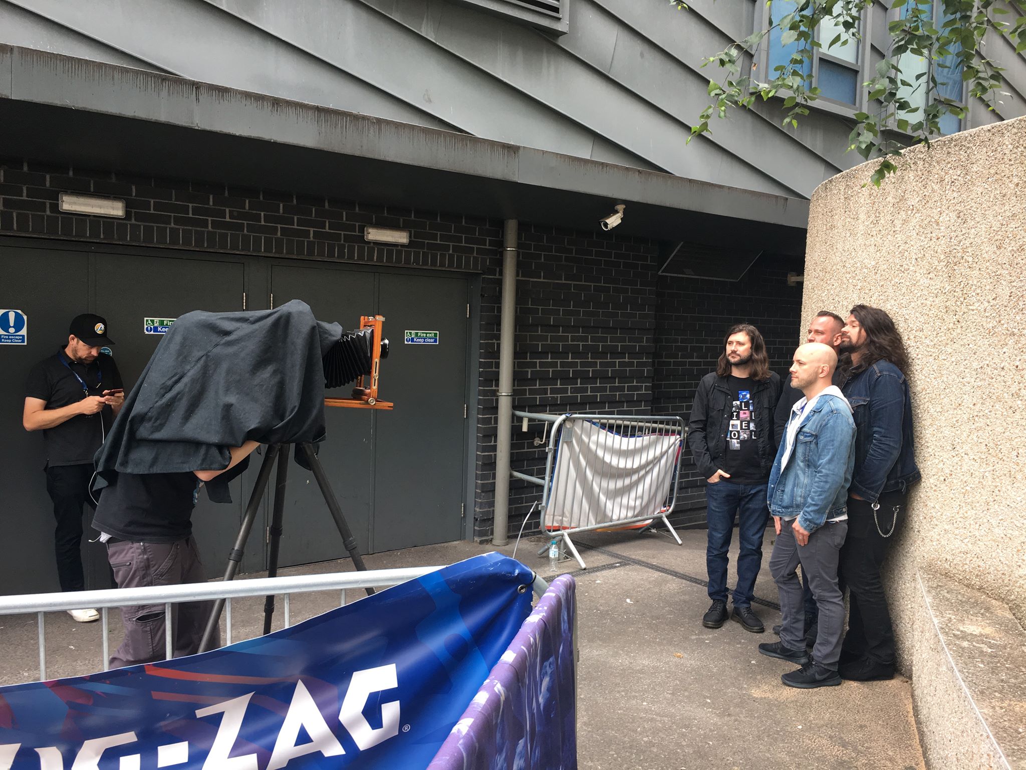 The camera in question leads us to the crux of our endeavour on this fine Thursday afternoon. The resulting wet plate portrait of the band, taken by perfectionist photographer Gareth Jarvis, is made by dipping a glass sheet into various chemicals, relaying the image onto said sheet, and using developer fluid to reveal the fruits of his labour.