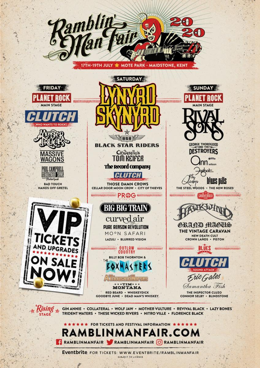 Who? Clutch will headline on July 17, while Lynyrd Skynyrd will top the bill on July 18, with Rival Sons closing the party on July 19. Other acts set to perform across the three days include Ann Wilson, Blues Pills, George Thorogood, Foghat, Goodbye June, Black Star Riders, Grand Magus, Inspector Cluzo, Monster Truck, Hawkwind, Vintage Caravan, the New Death Cult, Piston, Crown Lands, Big Big Train, Curved Air, Pure Reason Revolution, Moon Safari, Lazuli, Blurred Vision, Phil Campbell and the Bastard Sons, Massive Wagons, Bad Touch, Hands Off Gretel, Eric Gales, Samantha Fish, Connor Selby, Blindstone, Billy Bob Thornton and the Boxmasters, Tom Kiefer’s Cinderella, the Record Company, Those Damn Crows, City of Thieves, A Thousand Horses, the Steel Woods, Tim Montana, Whiskey Dick, Dead Man’s Whiskey, the Quireboys, the New Roses, and Cellar Door Moon Crow.
