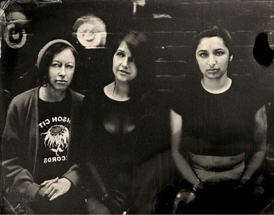 Following that very same soundcheck the band sat for the latest edition of Gareth Jarvis’s wet plate portrait series, which revives a process that dates back over 150 years. Finally, the photo shoot they deserve, jokes bassist Kelly-Dawn Hellmrich. Having to hold still for five seconds proves challenging for the spirited trio, though, and Maq has mixed feelings about the outcome.