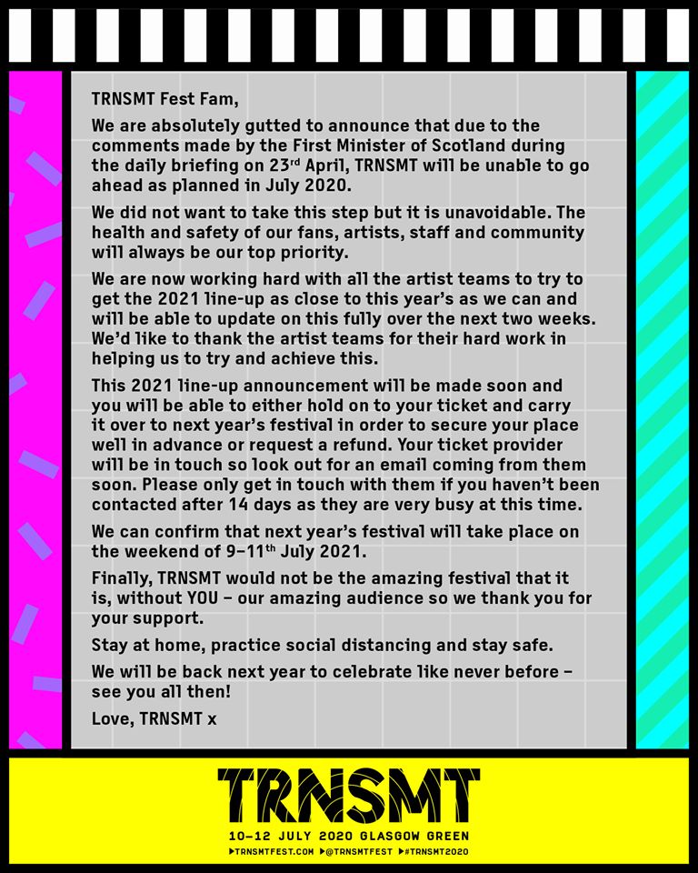 The three-day event was set return to Glasgow Green in July with headliners Lewis Capaldi, Liam Gallagher and Courteener, among others.