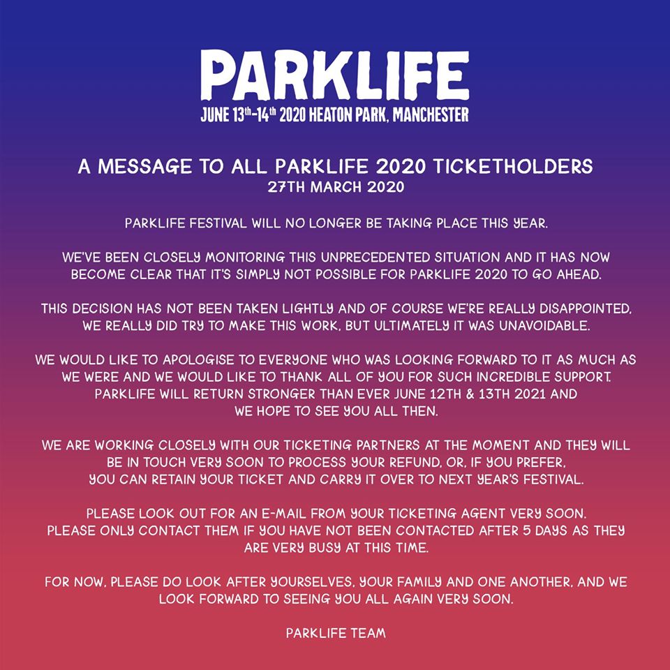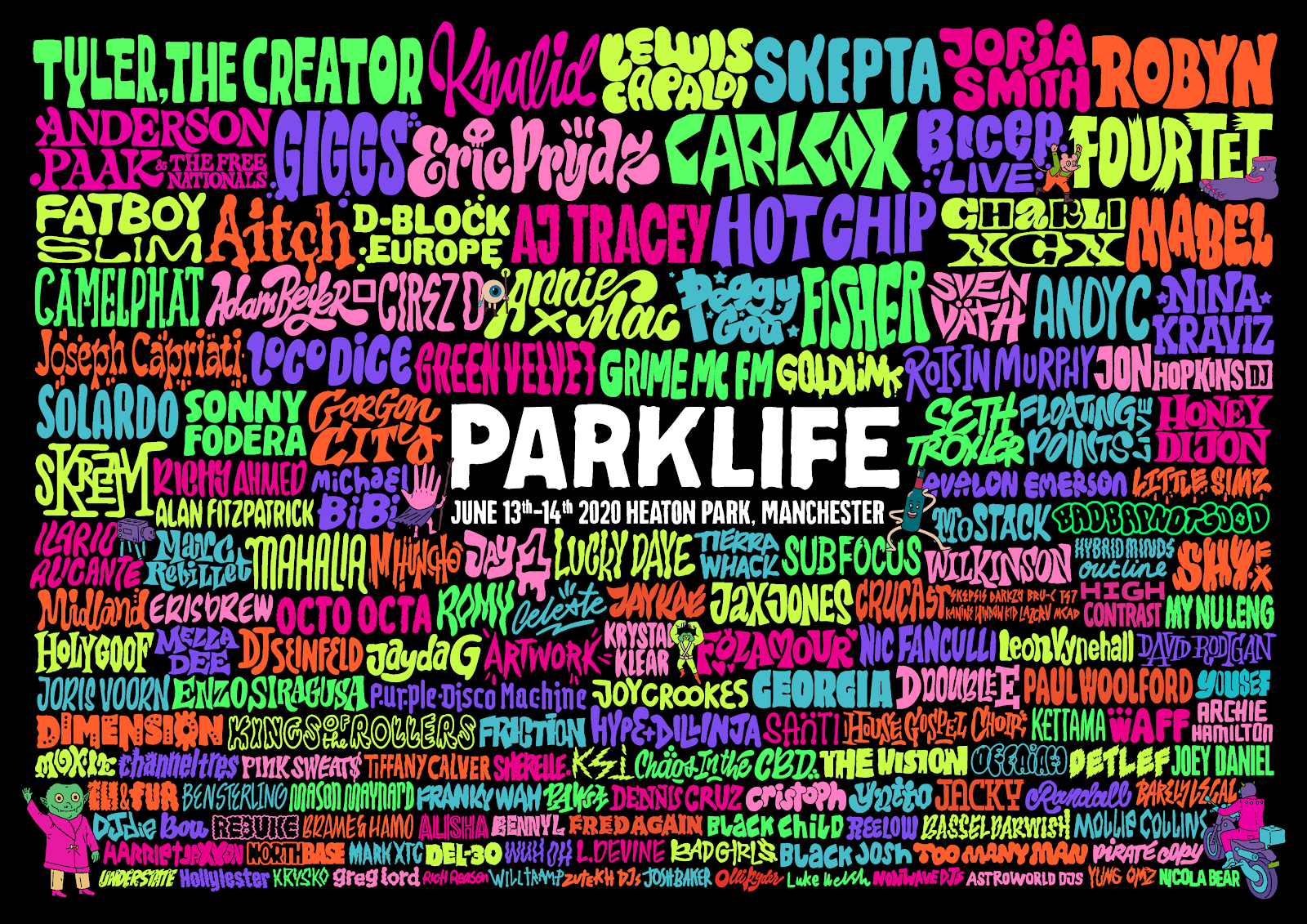 Who? Parklife 2020 was set to see performances from Tyler The Creator, Lewis Capaldi, Skepta, Khalid, Jorja Smith, Giggs, Anderson Paak, Robyn, Fatboy Slim, AJ Tracey, Charli XCX, Four Tet, Bicep, KSI, Aitch, Hot Chip, Annie Mac, Mabel, Peggy Gou, Carl Cox, D-Block Europe, Jon Hopkins, Romy (off of The xx), Eric Prydz, Georgia and many more.