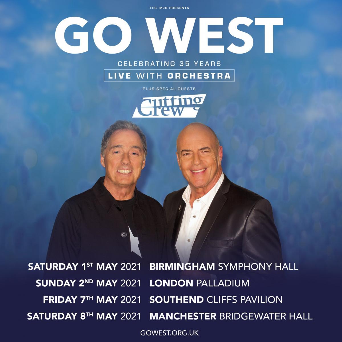Go West have also announced a handful of spring shows to celebrate their 35th anniversary. They'll perform with a live orchestra at Birmingham's Symphony Hall, London Palladium, Cliffs Pavilion in Southend-on-Sea, and Bridgewater Hall in Manchester during May 2021. Support will come from Cutting Crew. Tickets go on sale at 10am on September 11.