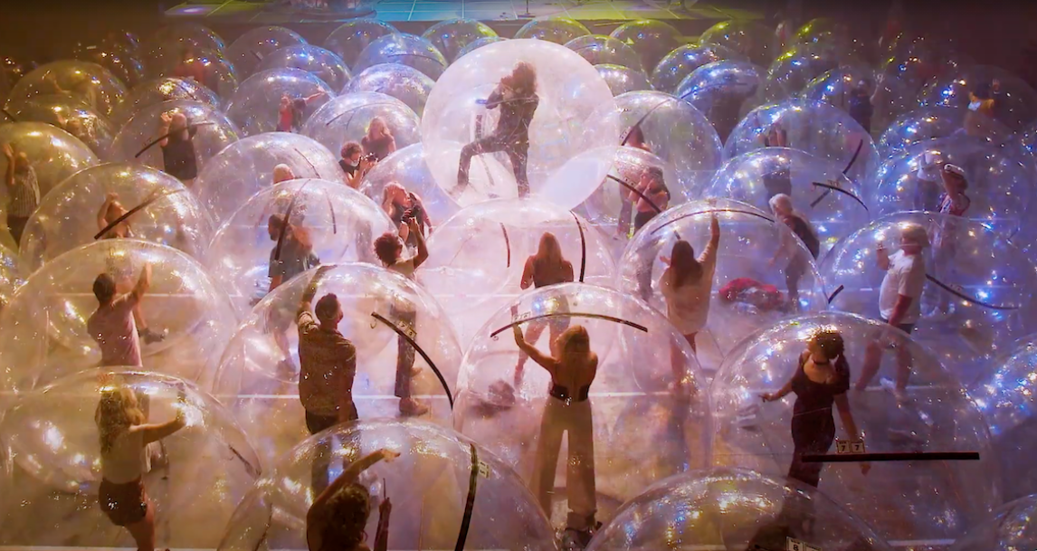 The clip, meanwhile, was directed by vocalist Wayne Coyne, with filming and editing handled by Blake Studdard for Atria Creative. It was shot during the Flaming Lips' recent socially distanced set in Oklahoma City where both the septet and members of the crowd were housed in inflatable bubbles.