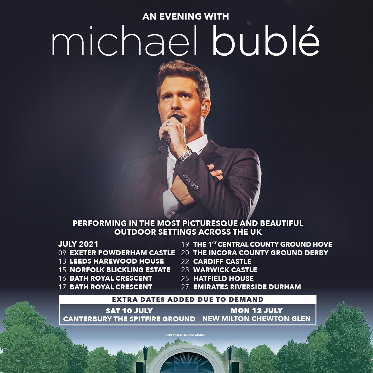 Due to demand, the vocalist will perform at Kent Cricket Club’s Spitfire Ground in Canterbury on July 10 and within the grounds of Chewton Glen Hotel and Spa two days later as part of his 13-date summer outdoor tour.