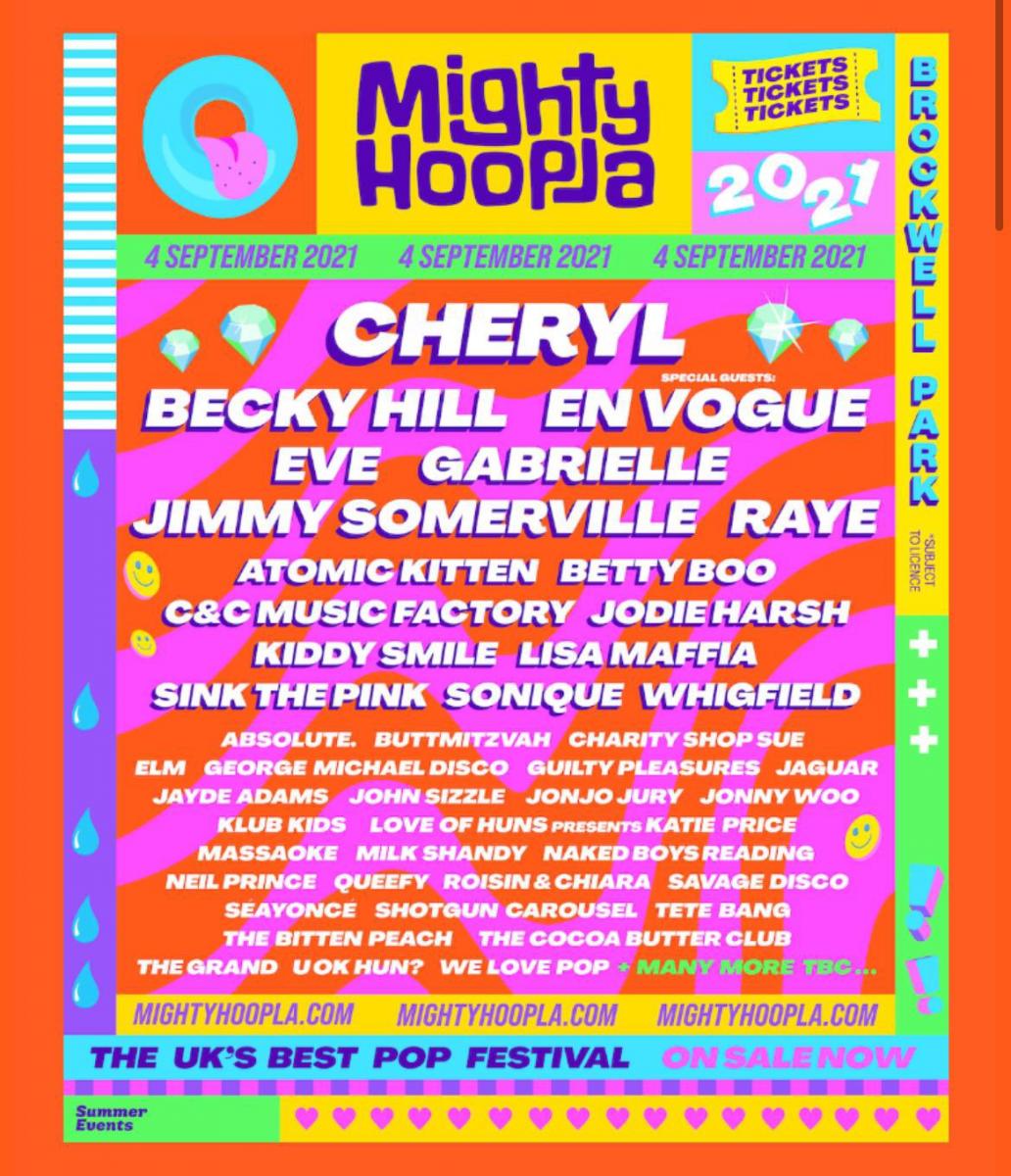 Who? Confirmed for 2021's line up are Absolute, Atomic Kitten, Becky Hill, Betty Boo, Buttmitzvah, C&C Music Factory, Charity Shop Sue, Cheryl, Elm, Special Guests: En Vogue, Eve, Gabrielle, George Michael Disco, Guilty Pleasures, Jaguar, Jayde Adams, Jimmy Somerville, Jodie Harsh, John Sizzle, Jonjo Jury, Jonny Woo, Kiddy Smile, Klub Kids, Lisa Maffia, Love Of Huns presents Katie Price, Massaoke, Milk Shandy, Naked Boys Reading, Neil Prince, Queefy, RAYE, Roisin and Chiara, Savage Disco, Shotgun Carousel, Sink The Pink, Sonique, the Bitten Peach, the Cocoa Butter Club, the Grand, U OK Hun?, We Love Pop, and Whigfield. More acts are to be confirmed in due course.