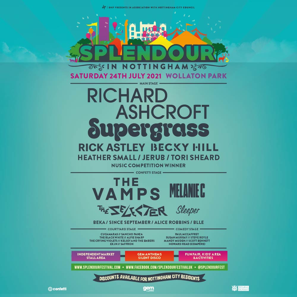 Who? Richard Ashcroft and Supergrass will headline the main stage, while The Vamps, Melanie C, The Selecter and Sleeper will appear on the Confetti Stage. Also set to perform is Rick Astley, Becky Hill, Heather Small, Jerub, Tori Sheard, Beka, Since September, and Alice Robbins.