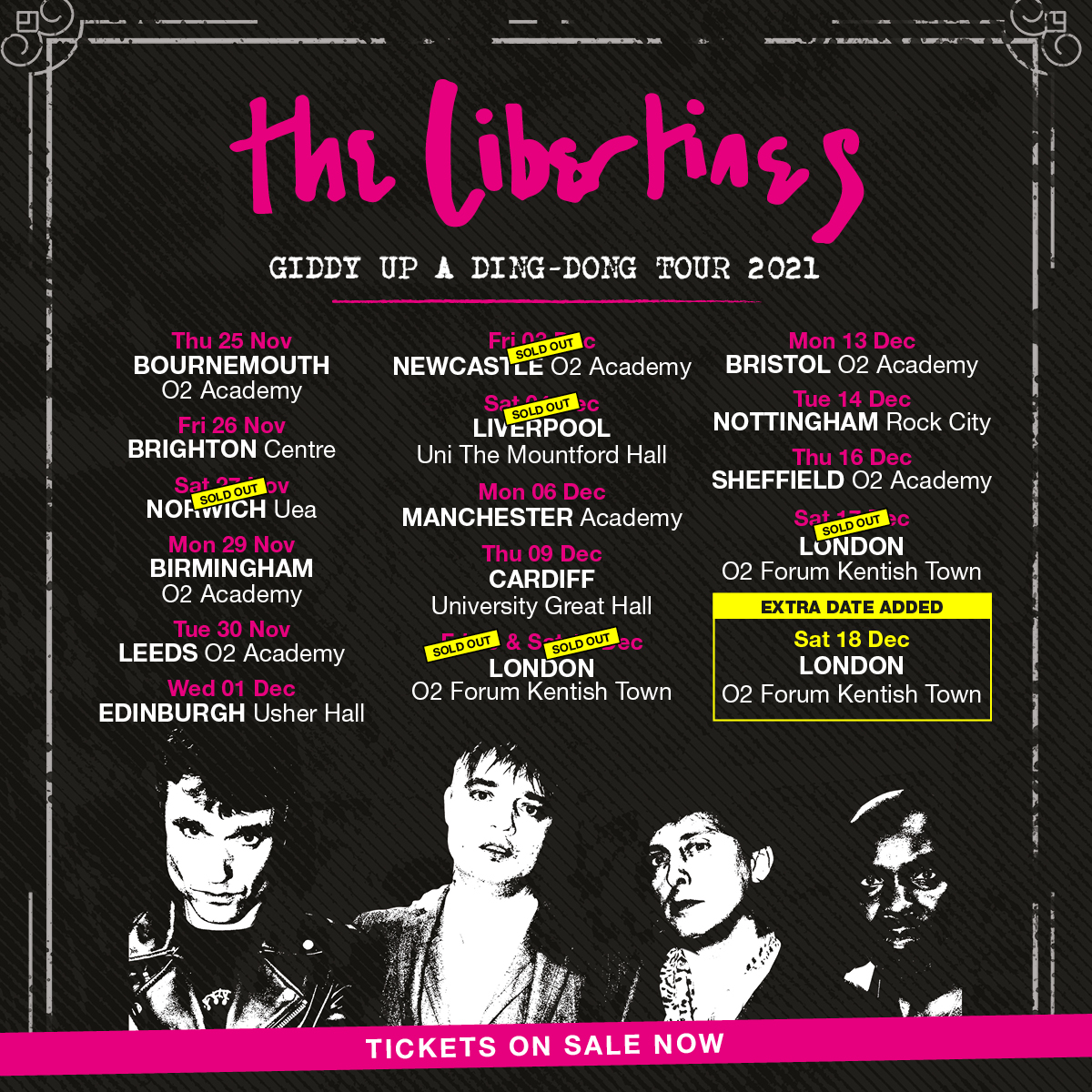 Due to demand, the band will play a third show at the O2 Forum Kentish Town on December 17 and a fourth the next day as part of their recently announced Giddy Up A Ding-Dong Tour.