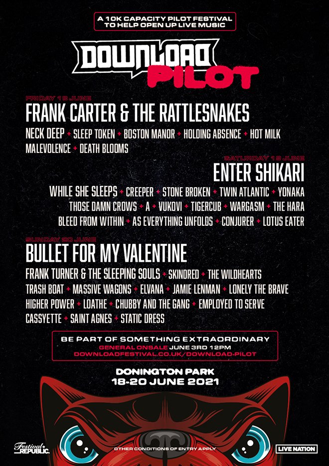 “We’re incredibly excited to safely welcome back fans to Donington Park and honoured to play a vital part in the return of live music to the UK. Putting together a line-up of 40 outstanding bands including headliners like Frank Carter & The Rattlesnakes, Enter Shikari and Bullet For My Valentine, is something the Download brand is uniquely able to do and made possible by a thriving UK rock scene and deep pool of in-demand talent. With moshing back on the cards, this is going to be a true celebration of festival spirit and something special to be a part of.”