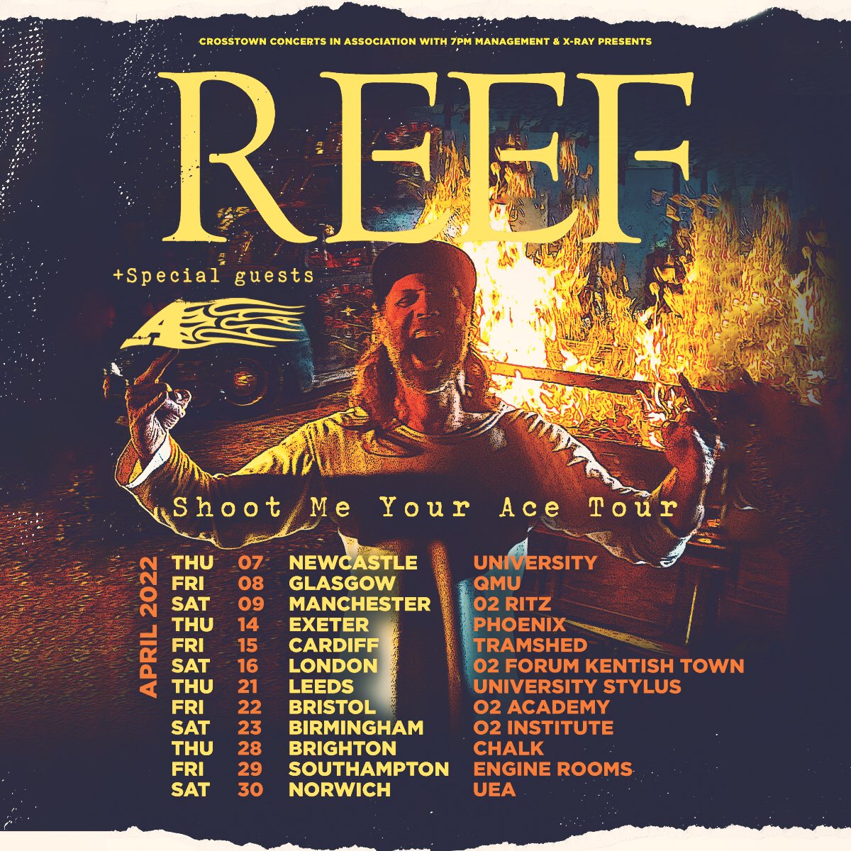 Bassist Jack Bessant said: “We are super stoked to be heading back out on the road again in April 2022 AMAZING! It’s gonna be such a blast to play new songs from our forthcoming album mixed up with Reef classics. Also to see and rock out with our fans after all this time will be truly special as we have all missed the energy flow between the band & our fans when playing live. BRING IT ON!”
