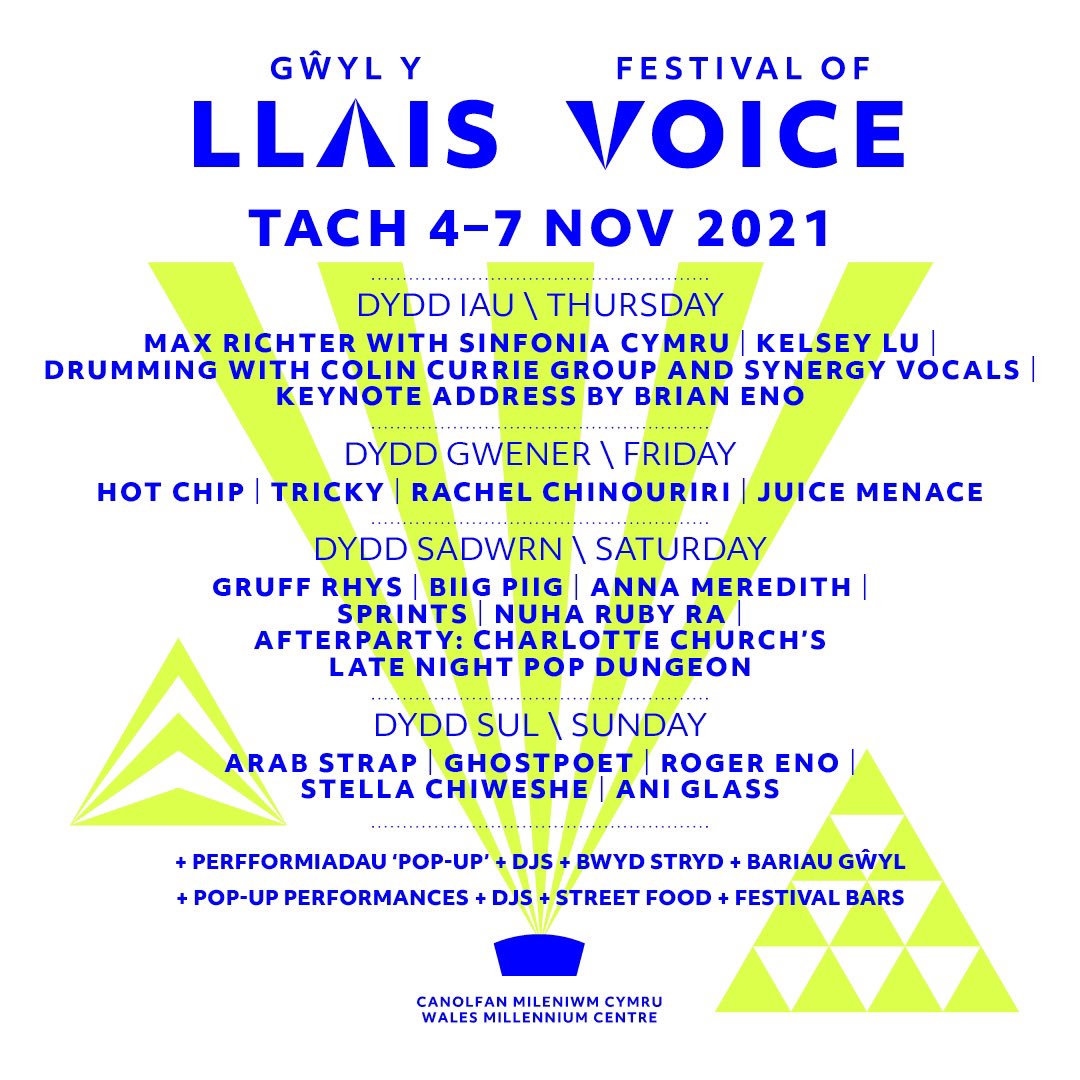 Artists set to appear include composer Max Richter, playing for the first time in Wales with Sinfonia Cymru, Brian Eno, who will deliver the festival's opening keynote address, Roger Eno, Arab Strap, Hot Chip, Stella Chiweshe, Charlotte Church's Late Night Pop Dungeon, Tricky, Kelsey Lu, Juice Menace, Anna Meredith, Gruff Rhys, and Ghostpoet, among others.