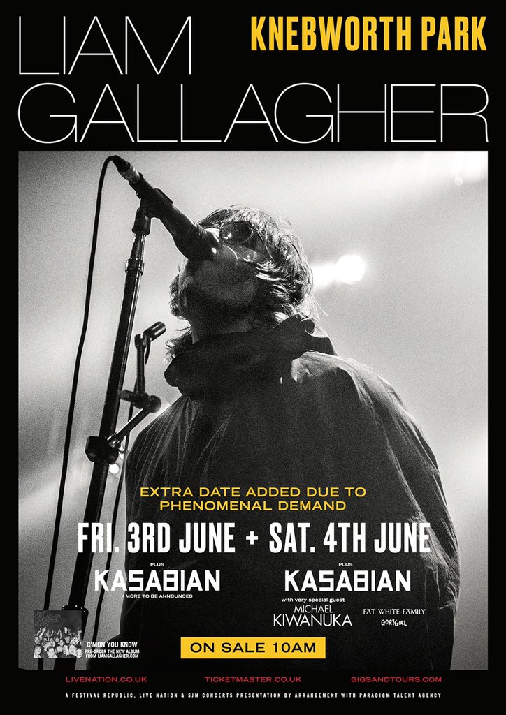 Due to overwhelming demand, the former Oasis frontman will now also headline Knebworth Park in Stevenage on June 3 with support from Kasabian and more acts that are still to be announced.