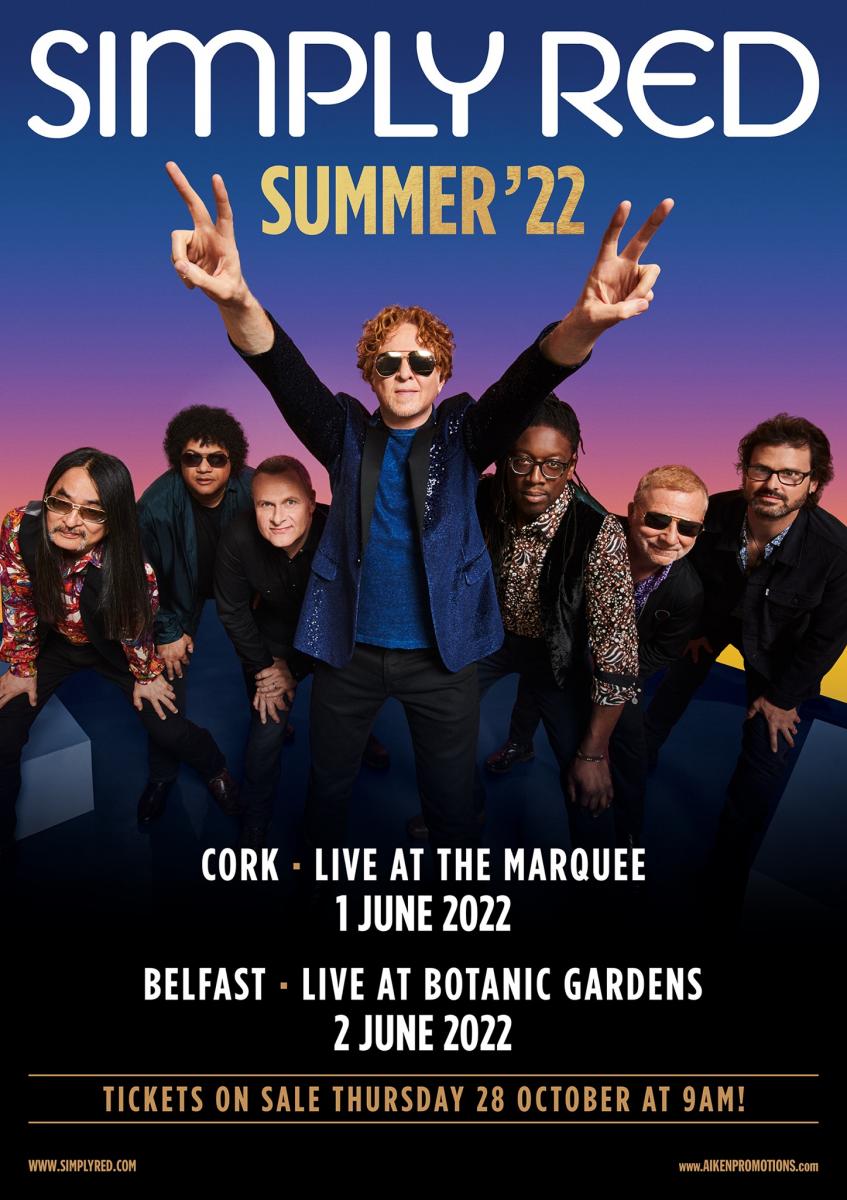 Mick Hucknall and band will play Live At The Marquee in Cork and Belfast's Botanic Gardens on June 1 and 2, respectively, with tickets on sale at 9am on October 28.