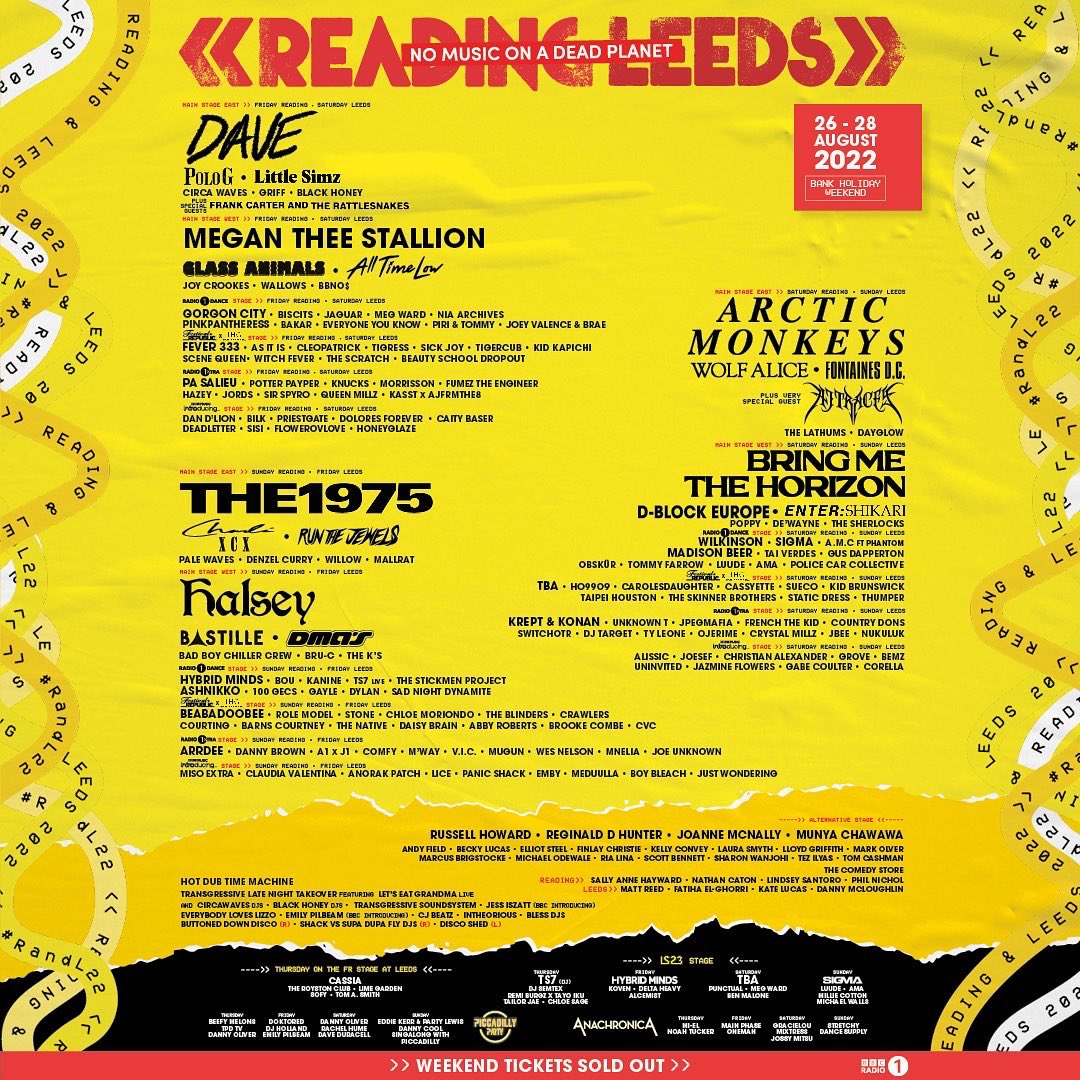Who? The weekend will be headlined by Arctic Monkeys, Dave, The 1975, Halsey, Megan Thee Stallion and Bring Me The Horizon. Also set to appear are the newly announced Charli XCX and AJ Tracey, as well as Run The Jewels, Bastille, Wilkinson, Wolf Alice, Fontaines D.C., Glass Animals, Little Simz, Arrdee, Circa Waves, Chloe Moriondo, Denzel Curry, Fever 333, Griff, Hybrid Minds, Joy Crookes, Jxdn, Kid Brunswick, Madison Beer, Pale Waves, Pinkpantheress, Polo G, Tai Verdes, Wallows, 100 Gecs, All Time Low, Bad Boy Chiller Crew, Beabadoobee, Black Honey, D-Block Europe, Danny Brown, DJ Target, DMA’S, Enter Shikari, Everyone You Know, Frank Carter & The Rattlesnakes, Gorgon City, Gus Dapperton, Hazey, Jaguar, JPEGMAFIA, Krept & Konan, Morrisson, Pa Salieu, Poppy, Sigma, Static Dress, The Blinders, The Crawlers, The K’s, The Lathums, The Scratch, The Sherlocks, Tigercub, Willow, Witch Fever, Alissic, Anorak Patch, Ashnikko, Barns Courtney, Beauty School Dropout, BEMZ, BILK, Caity Baser, CASPR, Cassyette, Christian Alexander, Claudia Valentina, Corella, Courting, Daisy Brain, Dan D'Lion, Dayglow, DE’WAYNE, DEADLETTER, Dolores Forever, DYLAN, EMBY, Flowerovlove, Gabe Coulter, Glaive, Grove, HO99O9, Honeyglaze, Jazmine Flowers, JBee, Joe Unknown, Joesef, Jords, Just Wondering, Lice, Luude, Mallrat, Meduulla, Miso Extra, Panic Shack, Phem, Police Car Collective, Priestgate, SISI, Stone, Taipei Houston, The Native, and The Skinner Brothers, among others you can check out on the poster below.