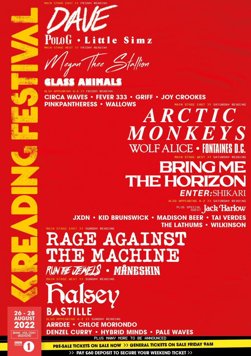 Who? The weekend will be headlined by Arctic Monkeys, Dave, Rage Against The Machine, Halsey, Megan Thee Stallion and Bring Me The Horizon. Also confirmed for the bill are Run The Jewels, Bastille, Wilkinson, Wolf Alice, Fontaines D.C., Glass Animals, Little Simz, Arrdee, Circa Waves, Chloe Moriondo, Denzel Curry, Fever 333, Griff, Hybrid Minds, Jack Harlow, Joy Crookes, Jxdn, Kid Brunswick, Madison Beer, Måneskin, Pale Waves, Pinkpantheress, Polo G, Tai Verdes, and Wallows. Many more acts are still to be announced.