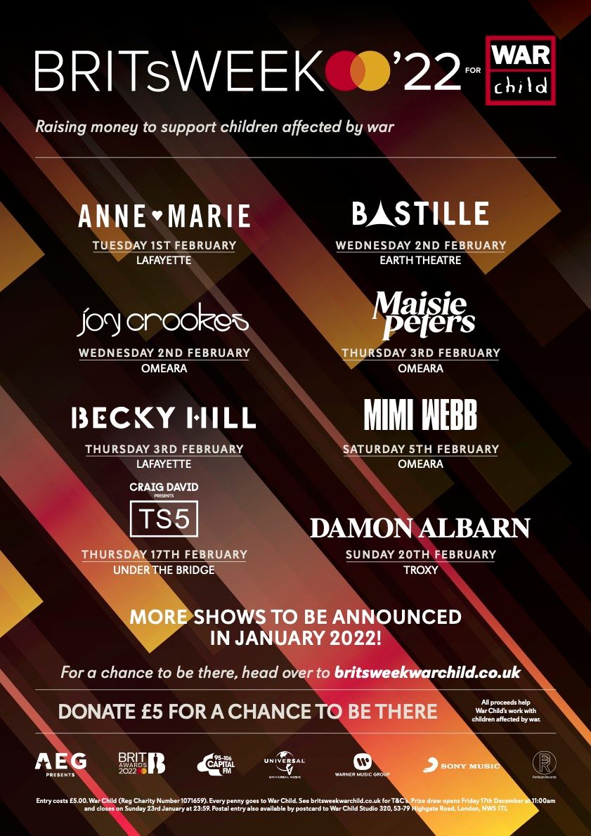 Further shows are to be confirmed in January. Meanwhile, tickets go on general sale at 10am on December 17. Head to britsweekwarchild.co.uk for priority tickets and a chance to win a pair of tickets to the show(s) of your choice by donating £5 to War Child.