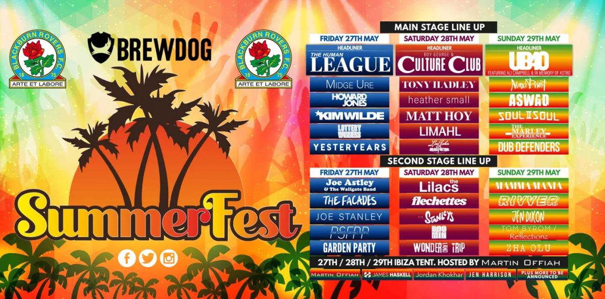 Summer Fest will take over Ewood Park, the home of Blackburn Rovers football club, in May, with The Human League as Friday's headline act, Boy George and Culture Club as Saturday's special guests, and UB40 featuring Ali Campbell as Sunday's headliner.