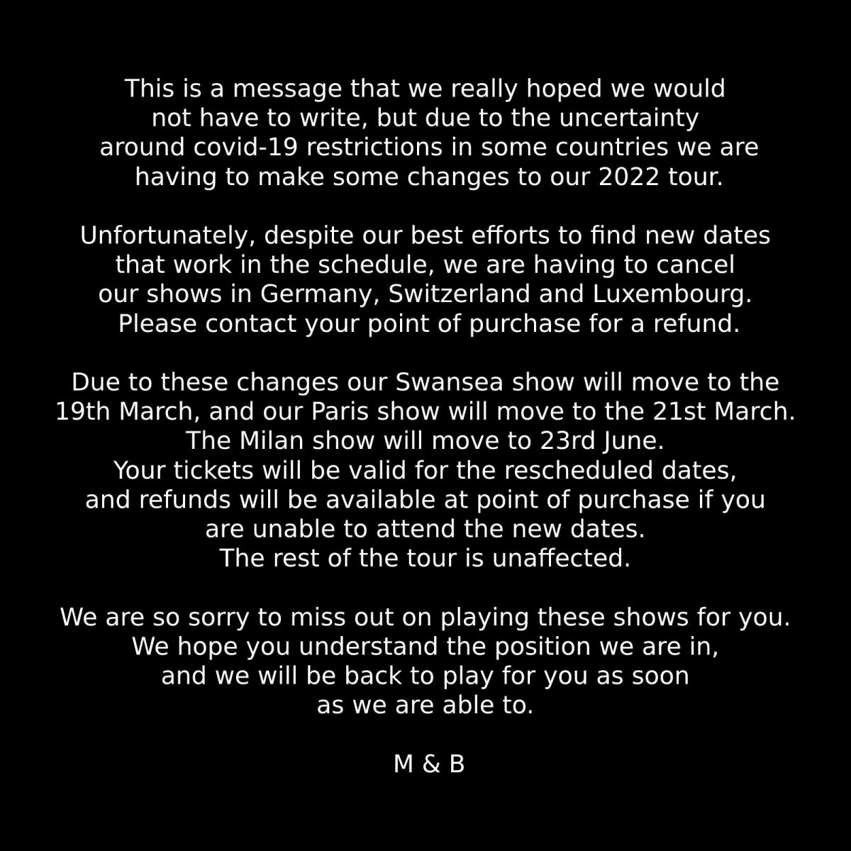 Due to COVID-19, the rock duo have cancelled their shows in Germany, Switzerland and Luxembourg, and rescheduled their shows in Swansea to March 19, Paris to March 21 and Milan to June 23. Original tickets will be honoured, and the remainder are on sale.