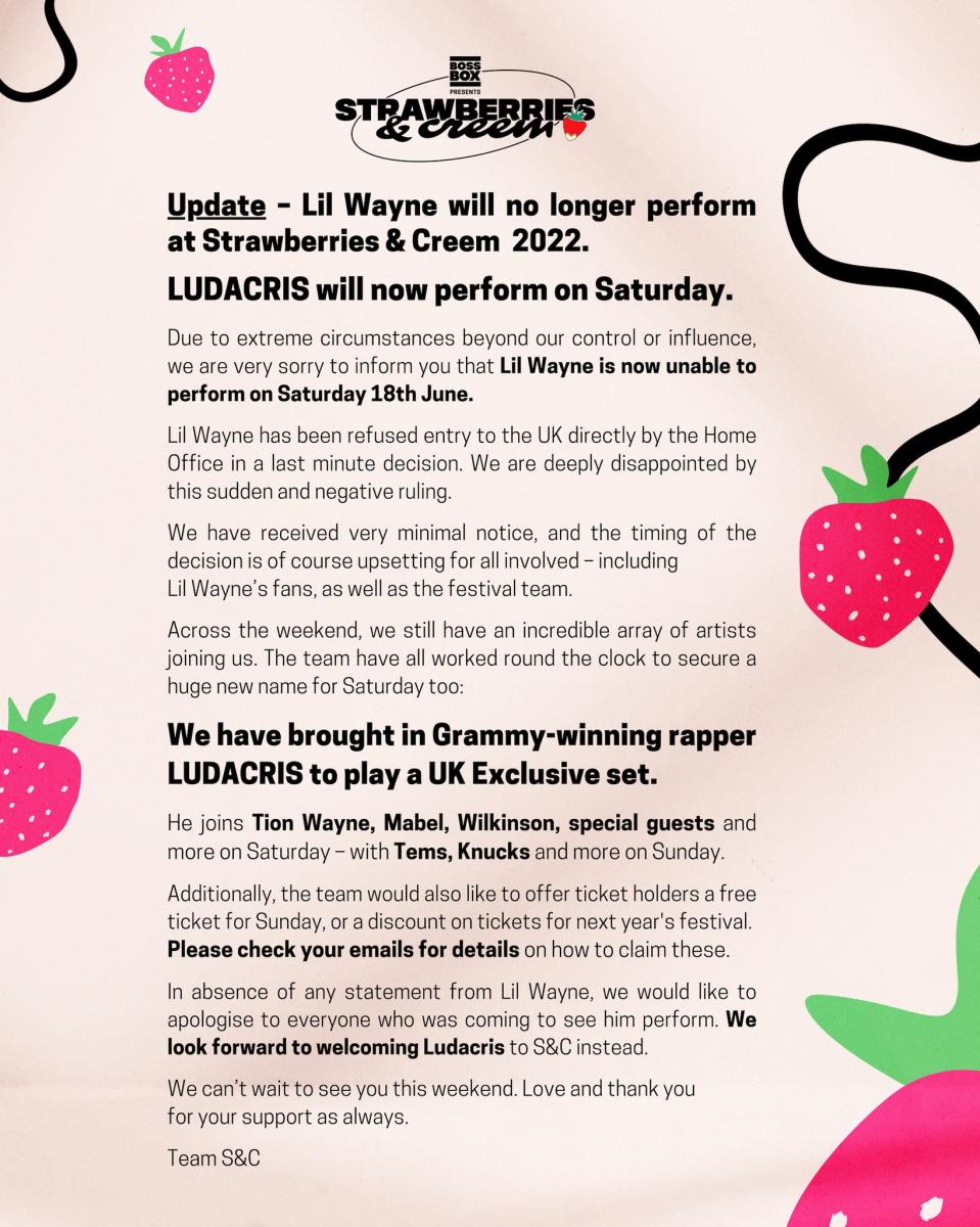In a post on social media, organisers revealed that Wayne was, "refused entry to the UK directly by the Home Office in a last minute decision." He was due to headline the Saturday, but will now be replaced by Grammy-winning American rapper and actor Ludacris, in what will be a UK exclusive set.