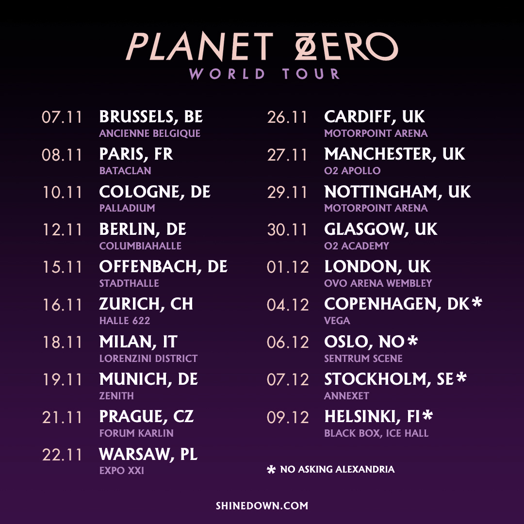 “We have always been inspired by the UK and European audiences. Their passion for music is extraordinary. We are beyond excited to be returning as headliners, with our biggest show yet! We are overwhelmed by the love and support of our new album, PLANET ZERO and look forward to sharing our new songs, along with all of your SHINEDOWN favorites!!! Cheers!!!”