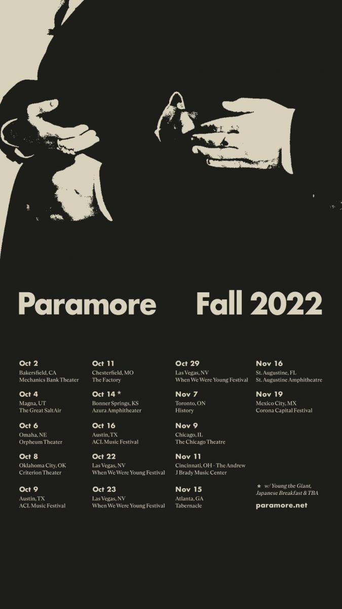 Hayley Williams, Taylor York and returning drummer Zac Farro will play intimate venues in Bakersfield, Magna, Omaha, Oklahoma City, Austin, Chesterfield, Bonner Springs, Toronto, Chicago, Cincinnati, Atlanta and St Augustine between October 2 and November 16.
