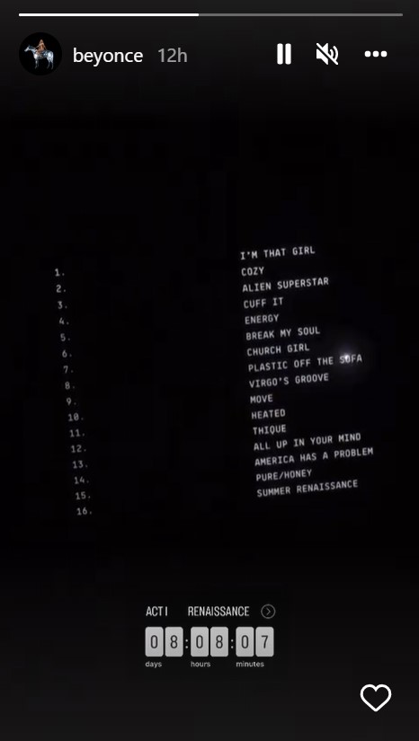 'Renaissance', the follow-up to 2016's 'Lemonade', will arrive on streaming services on July 29. According to the superstar's recent Instagram Stories post, it'll feature 16 tracks, including the record's recently revealed first single, Break My Soul.