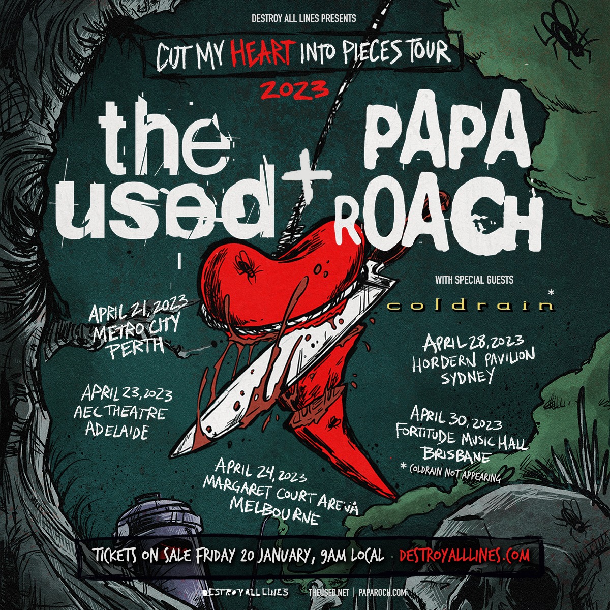 For all but the last show, The Used (pictured) and Papa Roach will be joined by Japanese post-hardcore band Coldrain. Tickets go on general sale at 9am local time on January 20.