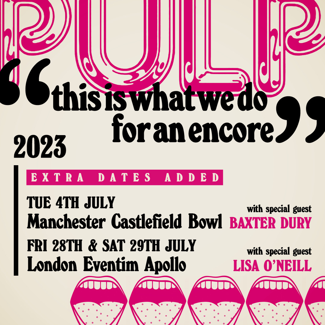 Pulp have added new shows in Manchester and London to their summer UK and Ireland tour, and billed them as "this is what we do for an encore." Pulp tickets go on sale at 9am today.